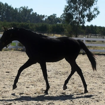 Cherry is a very attractive, black, rising 3yo filly. Cherry very happily walks up to you in the paddock, she is an absolute delight to be around and her wonderful temperament makes her easy to groom and have her feet trimmed without even putting a halter on her. She is very easy to catch, lead around and hose down. She is currently learning her groundwork and her intelligence as well as trust in people is making this process very straight forward. Cherry has three very free and correct paces, but her jumping is where her talent is! Cherry has only been free jumped over some small jumps but her jump is incredible. She has huge scope and bascule, it's very exciting to watch her fly over the jumps so effortlessly and elegantly.